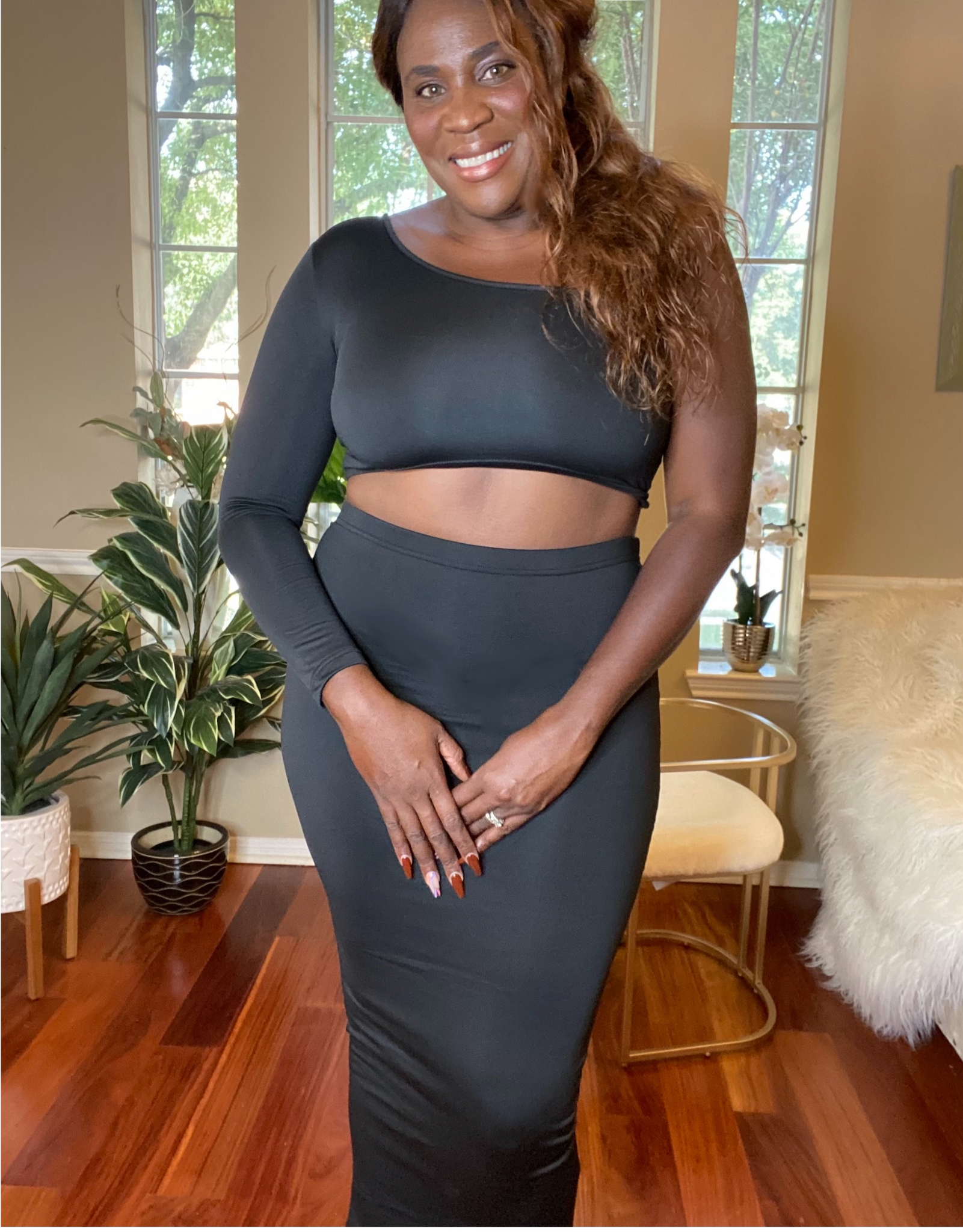 Our Enticing Lici is the perfect figure-flattering style. Comes with one shoulder long sleeve top and long fitted skirt. Pear with one of our fancy purse and you are ready to go. This dress shows your classy yet sexy style. Available in size Small, Medium and Large.